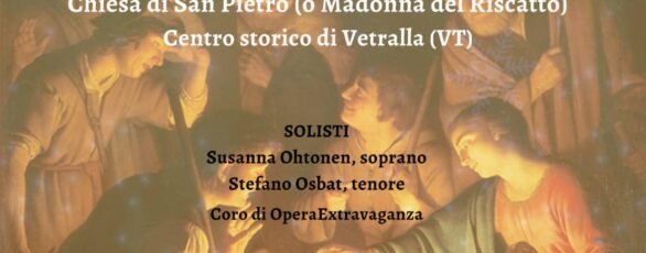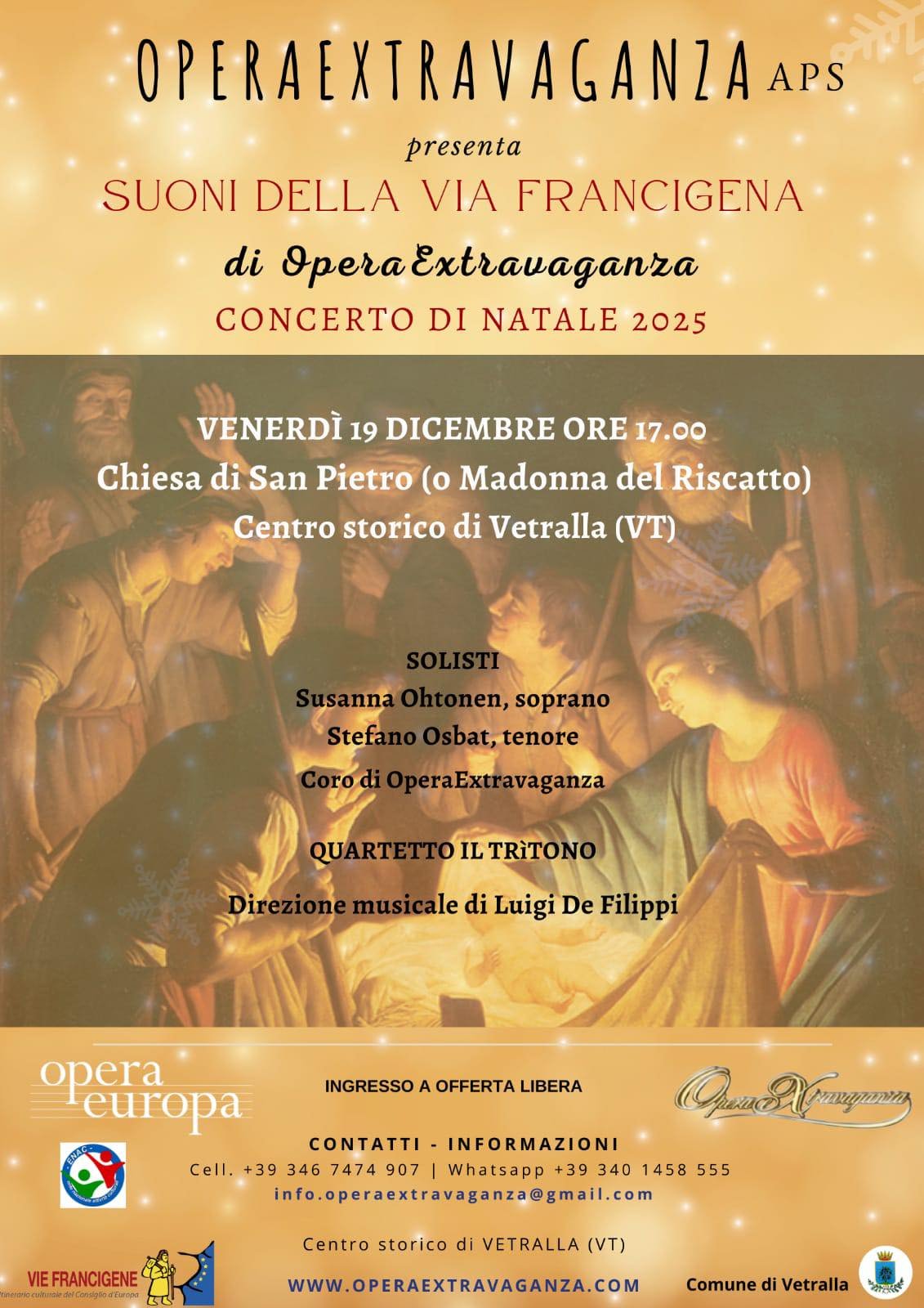 CONCERTO DI NATALE 2025 8 Gennaio, 2026 Categorie: Senza categoria SUONI DELLA VIA FRANCIGENA DI OPERAEXTRAVAGANZA Vi aspettiamo il 19 dicembre alle ore 17:00 nella suggestiva Chiesa di San Pietro nel centro storico di Vetralla. Ingresso a offerta libera