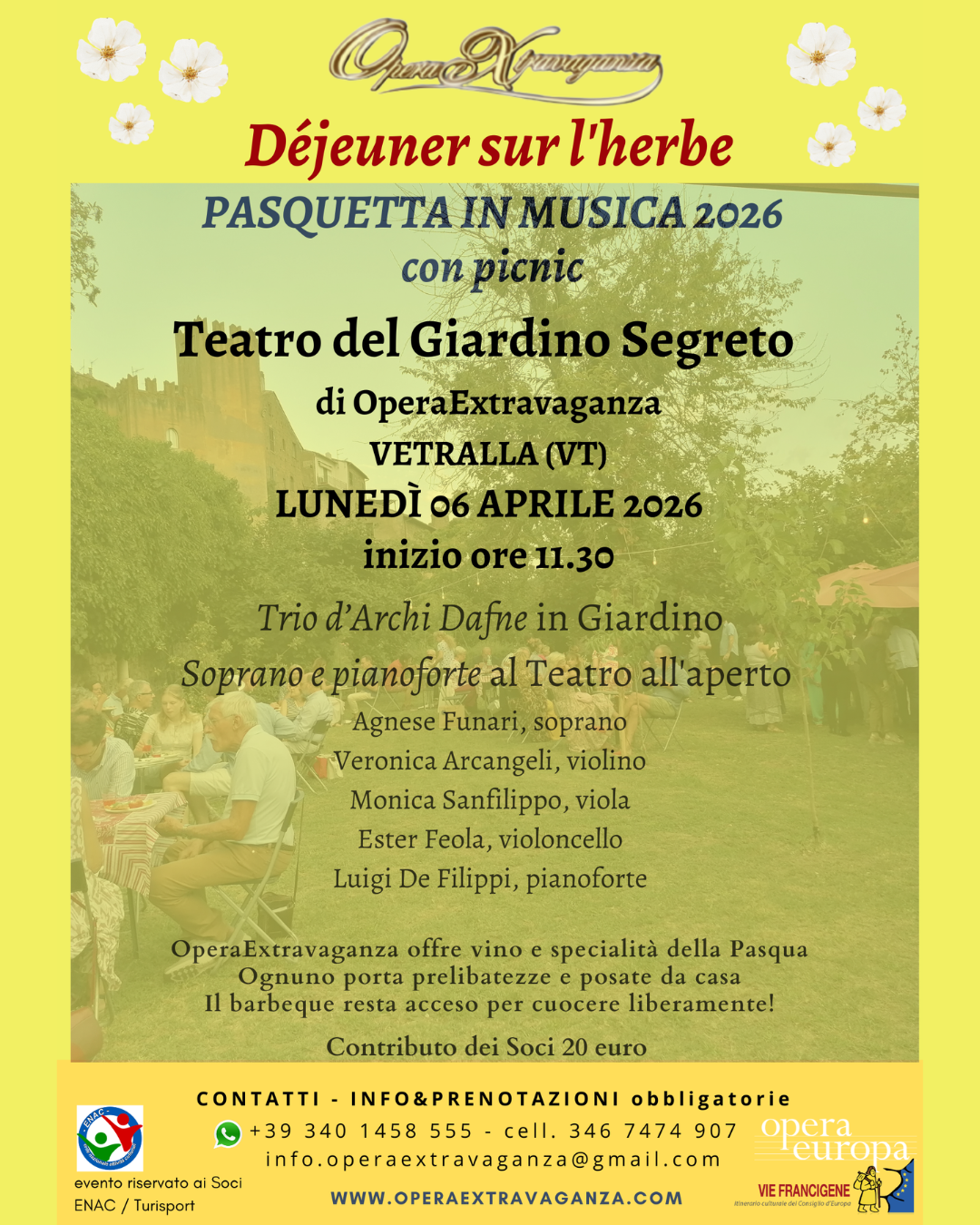 Lunedì 6 aprile, OperaExtravaganza ha il piacere di invitarvi al Giardino Segreto a partire dalle ore 11:30, per trascorrere insieme una giornata indimenticabile tra musica e picnic nel verde.