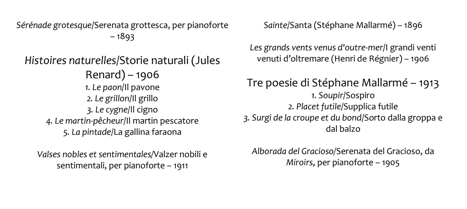 Famoso per la sua trascrizione dei Quadri da un’esposizione di Mussorgsky, Ravel fu abilissimo nell’arrangiamento per ogni formazione, dai piccoli gruppi da camera alle grandi orchestre.